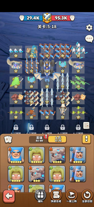 2、但是本阵容仅适合主线小怪关,boss关与竞技场中是一定要使用英雄士兵结合的阵容的,正常小怪关卡中敌方都比较无脑可以开自动过,boss关和竞技场中敌方配队变成了英雄和士兵结合,英雄可以给队伍提供不同的增益效果,在玩家抽卡资源够的情况下推荐尽快进行英雄的抽取。