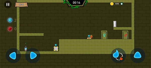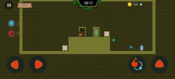 3、在游戏中,放置了很多种道具供大家使用,例如这块石头,玩家需要操控火娃娃将那块石头推下去,这样冰娃娃才能轻松跳跃上来。
