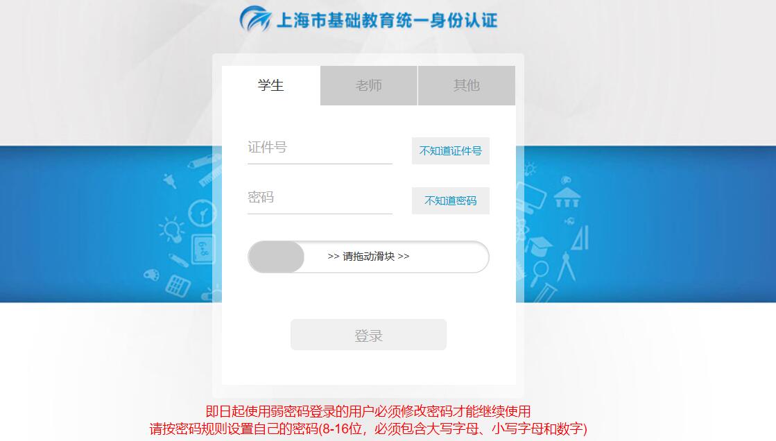 登陆方式:教师通过师训号(师训平台记录的师训号)或身份证件号登录,学生通过学籍副号或身份证件号登录,初始密码:SHedu@身份证号码后6位。