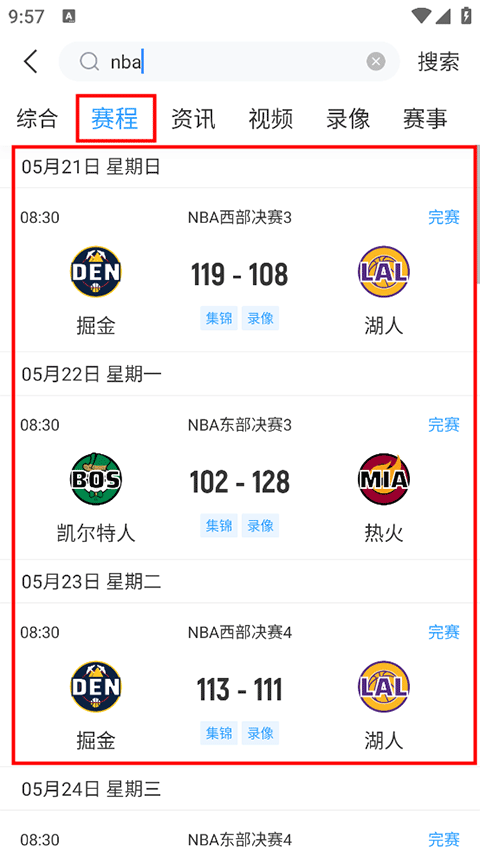 2、搜索后选择赛程页面,就可以看到近期的所有nba比赛的赛程表。