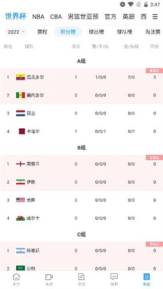 6、最后在数据页面中,还能查看各个国家比赛的分组情况,以及胜负,积分,排名等等。