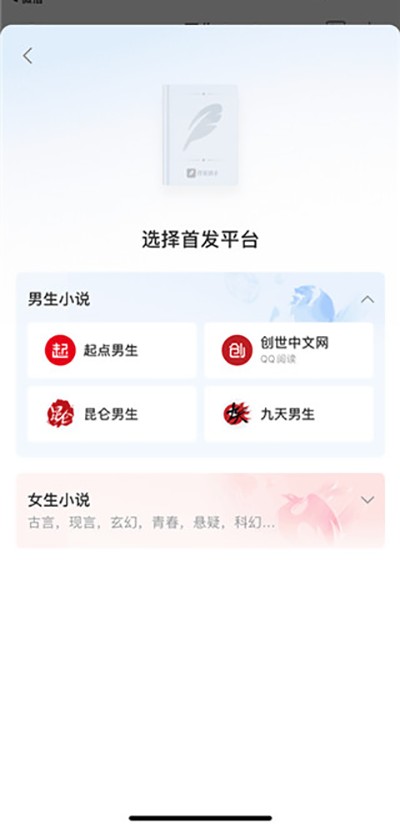 3、完成账号登录后,便可定义书名。之后选择首发平台,男生小说可选择的首发平台包括起点男生、创世中文网、昆仑男生和九天男生;女生小说可选择的首发平台起点女生、云起书院、红袖添香、潇湘书院、昆仑女生及九天女生等。