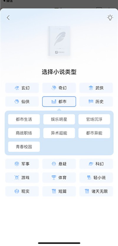 5、即便是同一个小说类型,能选择的细化分类也有很多,如都市类型包括:都市生活、娱乐明星、官场沉浮、商战职场、异术超能、都市异能和青春校园。