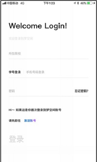 1、首先打开“到梦空间管理系统APP”,首次使用需要输入学号、姓名、手机、邮箱进行注册。