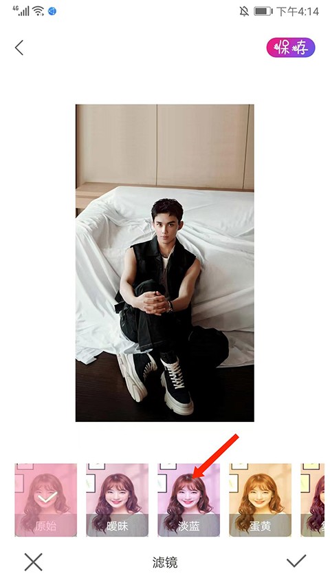 3、点击【滤镜】选项,滑动选择【淡蓝】等多种风格滤镜,