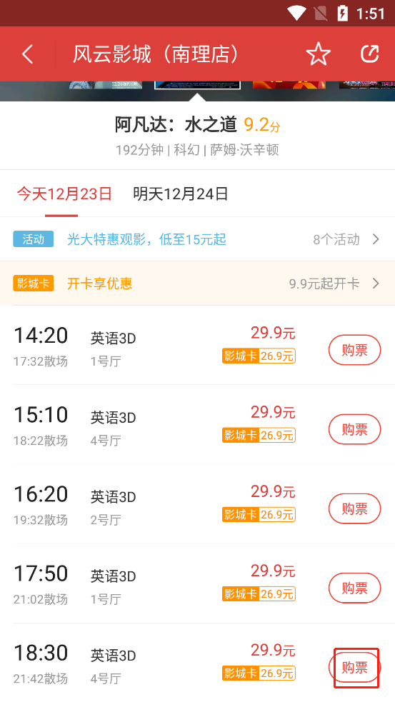 3、选择你想要的电影,场次,点击购票;