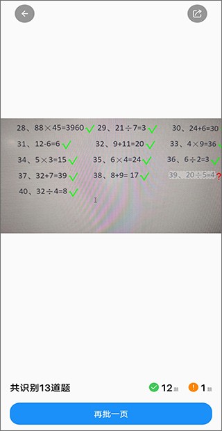 3、最后等待系统数秒,即可快速高效的批改孩子的口算作业,识别正确率也是非常高的,如果有多页也可以直接点击“再批一页”进行拍照。