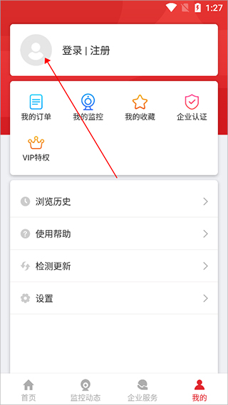 1、首次使用时可以进入应用的【我的】页面中点击左上角的头像图标(下图红色箭头所指区域)。