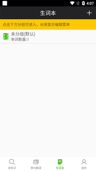 2、翻译过后的句子或者是词语系统会自动记录在生词本页面,想要学习的可以在这里点击学习,还可以将词语进行不同意思的分组