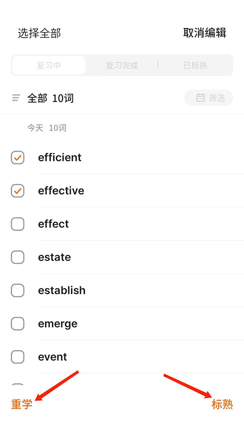 4、将下方单词进行勾选,选择“重学”或者“标熟”。