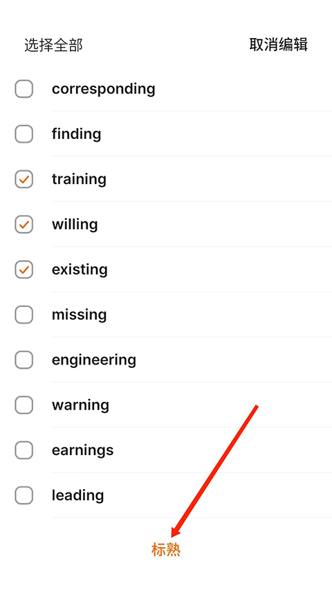 4、勾选需要的单词,然后选择“标熟”选项。