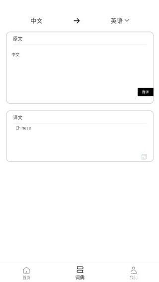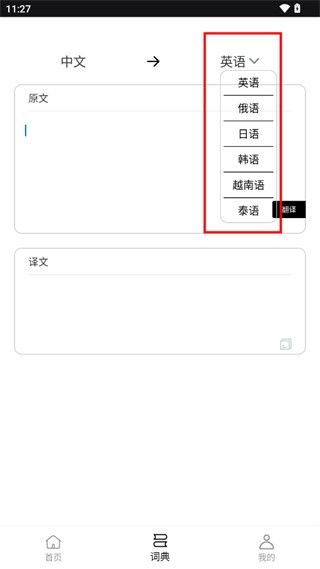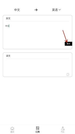 3、在“词典”界面,可以输入想要翻译的词或句子,可以选择翻译成别国的语言,点击“翻译”即可
