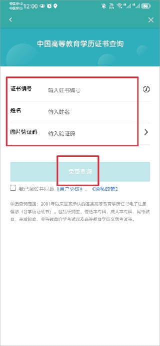 2、进入中国高等教育学历证书查询界面后,按照要求输入证书编号、姓名、图片验证码后,点击免费查询