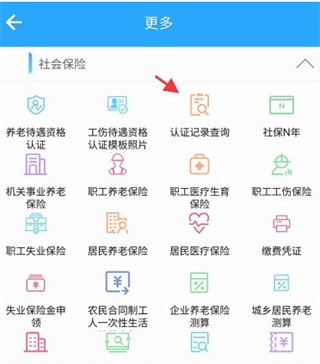 5、进入更多,找到社会保险,点击下方的认证记录查询进入,查看相关的信息。