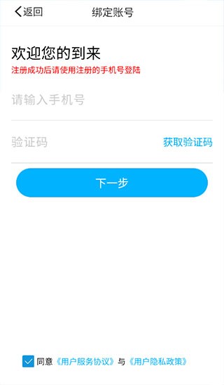 1、首先,打开慧知行高中版官方版,进入登录页,点击“绑定账号”(如未绑定账号则无法登录)