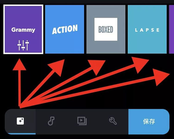 导入素材之后,你会看到下面的界面,Quik里面一共拥有22个模板,大家可以根据自己的喜好,挨个儿进行尝试,每个都点击一下。我个人比较偏向前三个模板:Grammy、ACTION、BOXED。手机版Quik软件每个模板都有自己的转场特效,但是,这个转场特效并不能人为添加,它会根据你所选择的音乐、以及片段中的声音,自行随机添加转场特效,而且并不是每个片段中间都会添加特效,所以需要“碰运气”,但是可以肯定的是,两个素材如果分别只有一两秒,在这两个素材中间,是不会有特效的,手机版Quik软件不希望用太多选项令界面过度复杂。