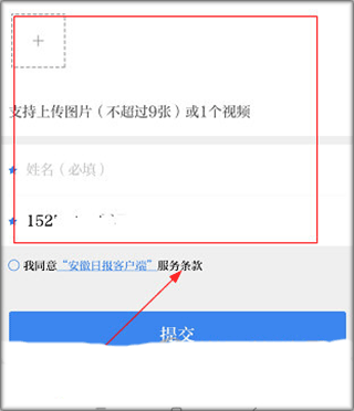 3、上传新闻的照片,报料人的姓名和手机号,同意服务条款,然后提交即可。