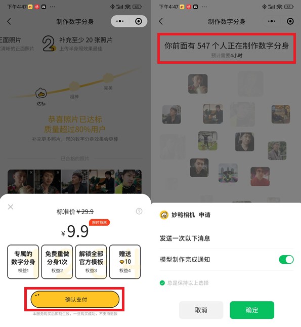 6、成功上传后,需要支付9.9元才可制作属于你的数字分身,根据当前排队人数等待,大约需要30分钟(不包含排队时长)才可成功制作你的数字分身。