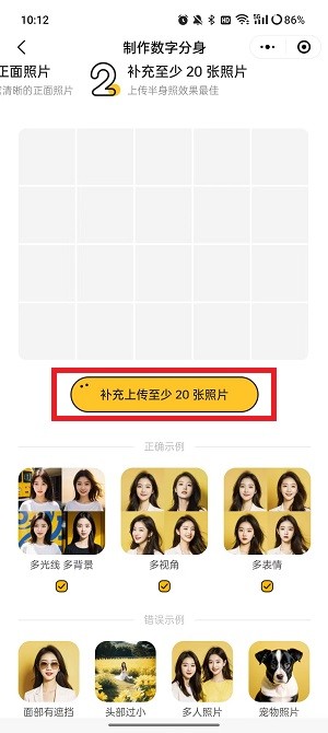 5、再补充上传至少20张照片,需包含人脸的合格照片,上半身照效果*佳,需要多光线、多背景、多视角、多表情。