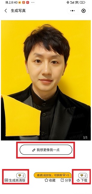 8、生成好写真照片后,可以选择喜欢的造型,同时还能进行高清化、更像我等精修操作。